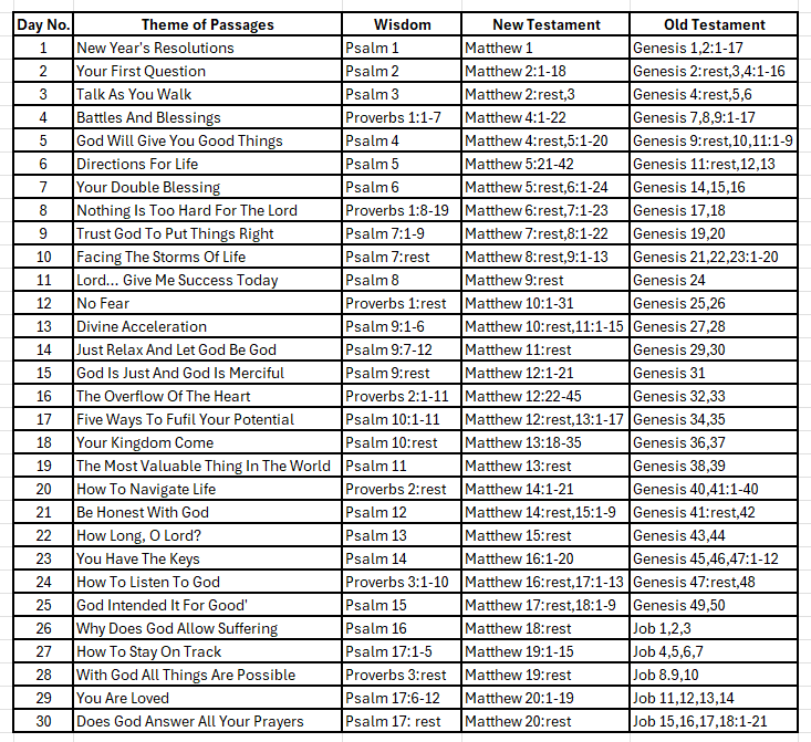 If you have been able to stick at the plan please be encouraged that you are well on the way to having a grasp of what the Bible has to say. Of the 66 books in the collection you have made inroads into 5 of them …… Genesis, Job, Psalms, Proverbs and Matthew’s gospel. Well done – half hour / day in time well spent.